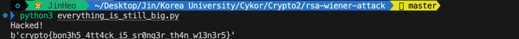 아무리 e를 구하는 조건이 달라졌다 하더라도, 여전히 N이 매우 크고 d가 상대적으로 작기 때문에 위너 공격이 유효한 상황이다. 따라서 이전 문제에서 위너 공격을 가한 코드를 빌려왔다.