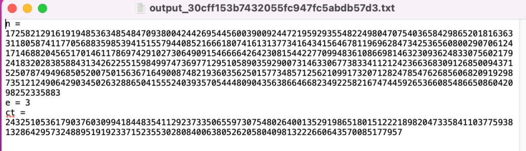 또한 결과 파일을 보면 n이 ct에 비해 훨씬 큰 수임을 확인할 수 있다. 이런 경우에는 ct의 세제곱근을 구하면 쉽게 pt를 구할 수 있다.